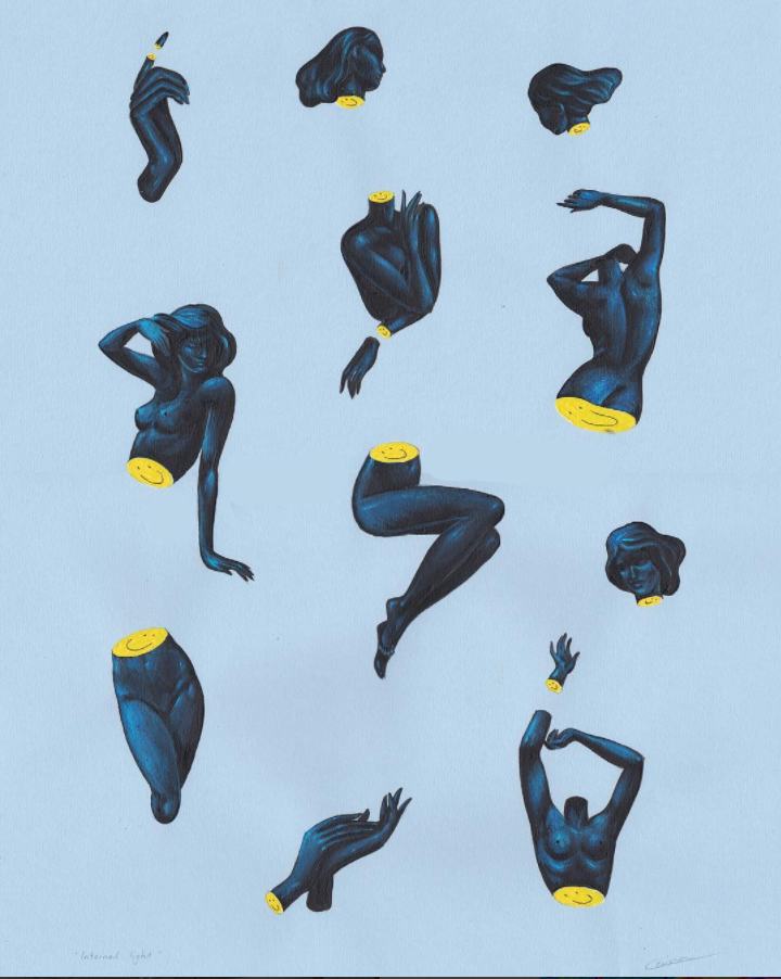“I created these little paintings of parts of the female form dissected to show the internal light being within. Female bodies are ultimate not because they define us by the way they look externally but because they contain the strongest connection to consciousness that we can access in the human experience.” Gina Kiel